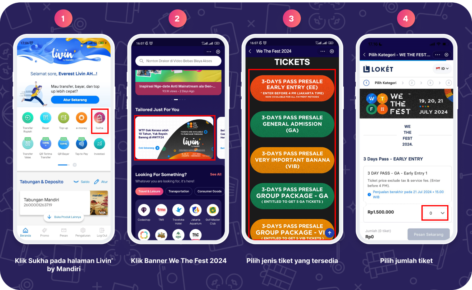 - Pembelian Tiket melalui Fitur Sukha di Livin’ by Mandiri (Virtual Account – Sumber Dana: Tabungan Mandiri)