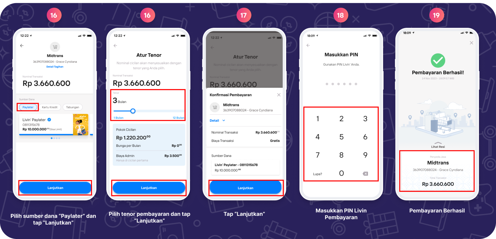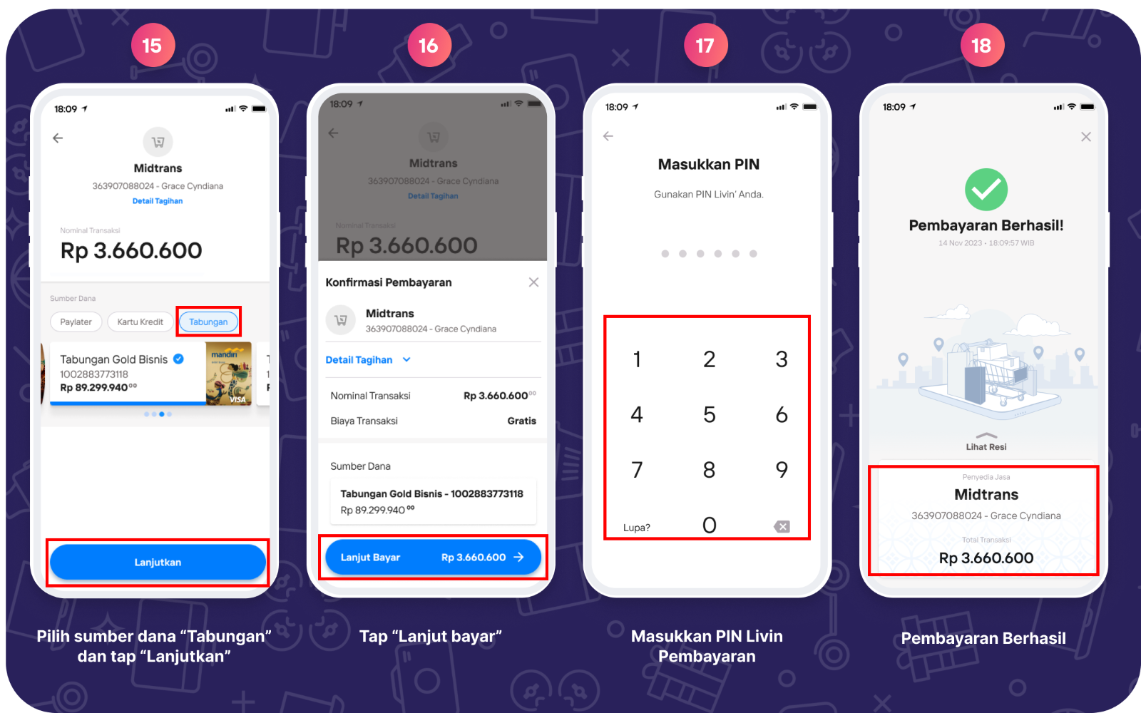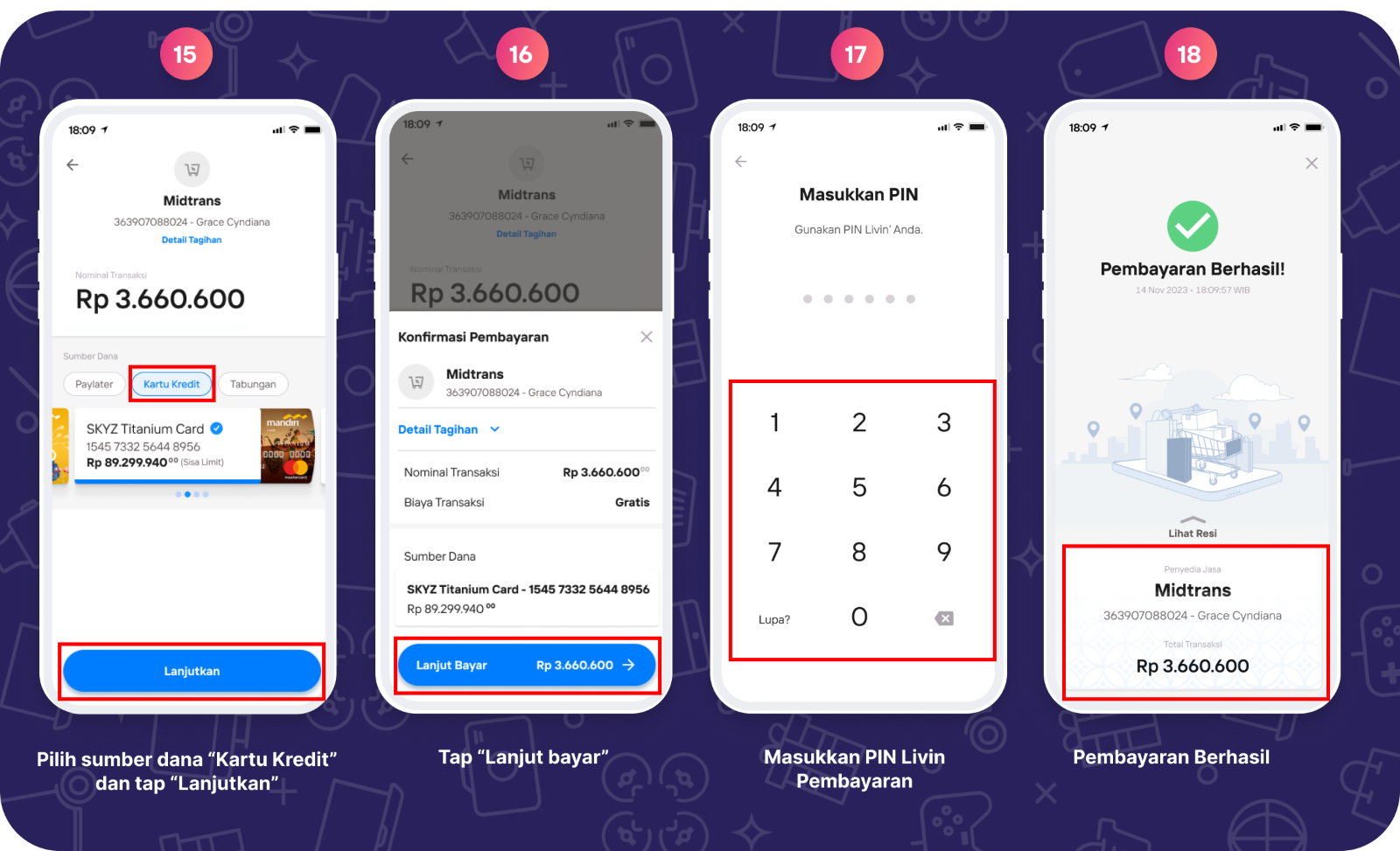 Pembayaran dapat dilakukan di Livin’ by Mandiri melalui Mandiri Virtual Account dengan Sumber Dana Tabungan Mandiri, Kartu Kredit Mandiri, dan Livin' Paylater