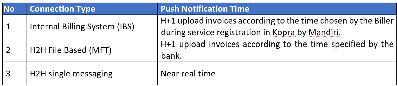 - Customers top up their push notification quota using the payment method displayed on the Kopra by Mandiri screen.