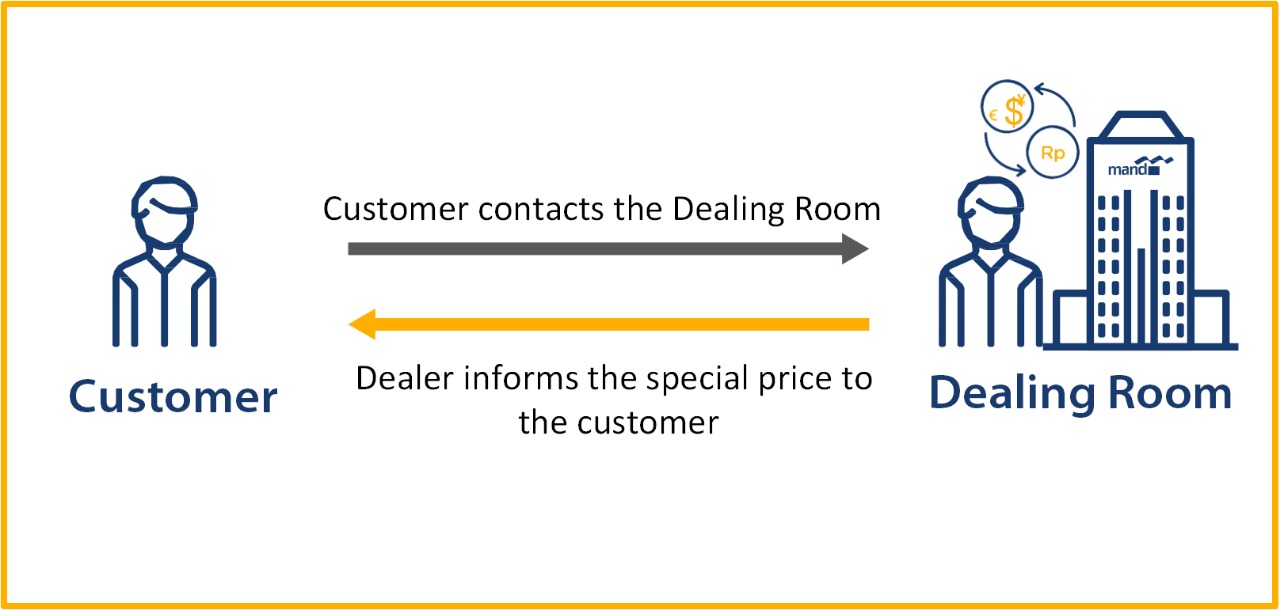 Treasury transaction is easier with Bank Mandiri. You will experience our simple and fast services. All you have to do is contact our dealer directly or through our many branches across in Indonesia and provide the necessary documents then your transaction can be immediately executed.