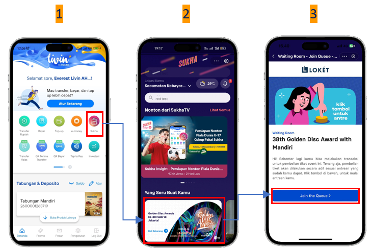 • Untuk menjaga kualitas penjualan, berdasarkan kebijakan Penyelenggara, Penyelenggara dapat mengarahkan Pengguna ke ‘halaman ruang tunggu’ setelah mengklik tombol penjualan Tiket sebelum Pengguna dapat memilih Tiket. Pada proses ini, Pengguna yang dapat membeli Tiket akan diurutkan sesuai dengan waktu masuk menu Sukha di aplikasi Livin’ by Mandiri.
