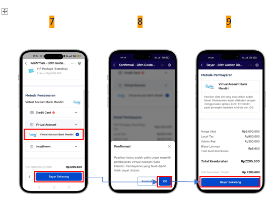 • Pembelian tiket melalui Livin’ by Mandiri menggunakan pembayaran dengan Virtual Account dan dapat menggunakan sumber dana Tabungan, Kartu Kredit, dan Livin’ Paylater