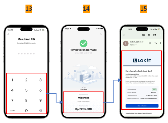 Setelah pembayaran menggunakan Livin’ by Mandiri (Virtual Account) dengan sumber dana Tabungan/ Kartu Kredit/ Livin’ Paylater berhasil, maka link booking confirmation akan dikirimkan maksimal 1x24 jam ke alamat email yang sudah didaftarkan saat mengisi identitas pembelian tiket. Pada H-3 event dimulai, link booking confirmation tersebut akan berubah menjadi e-tiket atau e-voucher yang dapat digunakan untuk masuk ke dalam acara.