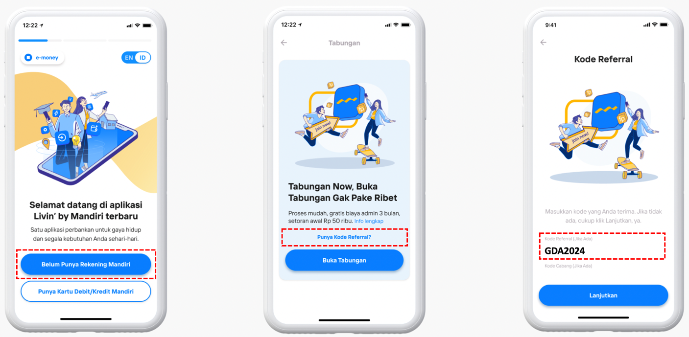 • Pembukaan rekening online yang dilakukan selama periode program melalui Livin’ by Mandiri menggunakan QR/Link Referral atau input kode referral GDA2024 pada saat melakukan proses buka rekening melalui Livin’ by Mandiri.