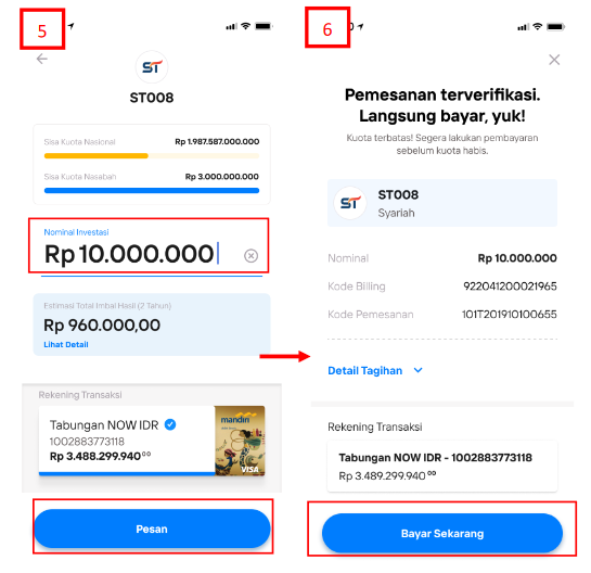• Nasabah akan masuk pada halaman detil produk yang berisikan data-data seperti Sisa Kuota Nasional, tanggal akhir penawaran, Imbal Hasil/Kupon per tahun, Jangka Waktu, Jatuh Tempo, Pemesanan Minimum, Pemesanan Maksimum, Kelipatan, Tanggal Setelmen, Imbal Hasil/Kupon Pertama, Jadwal Imbal Hasil/Kupon, Tipe Imbal Hasil/Kupon. Klik “Pesan” untuk melakukan pemesanan produk. Pada bagian bawah terdapat Memorandum Informasi untuk dipahami dan disetujui. Klik “Pesan” untuk melanjutkan.