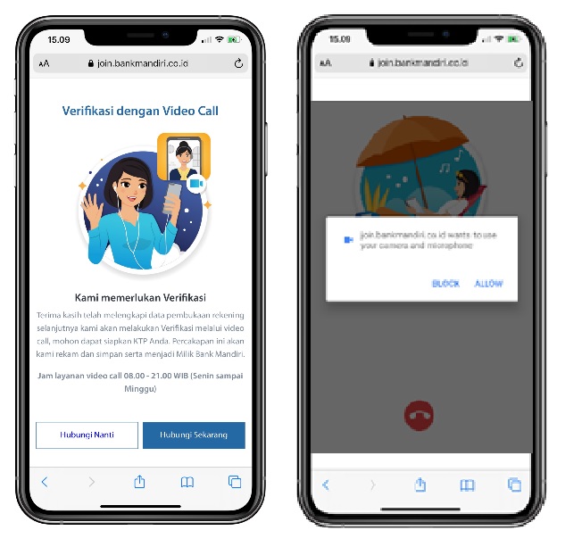 (Mohon pastikan calon nasabah memberikan izin untuk akses ke kamera dan microphone ponsel dan menggunakan browser yang Google Chrome (Android) atau Safari (iPhone). Jika Chrome tidak bisa melakukan video call mohon update Chrome ke versi terbaru di Play Store)