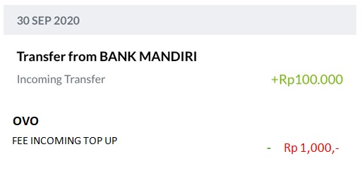 Sehubungan dengan perubahan ketentuan dari OVO, terhitung mulai tanggal 5 Juli 2021, untuk setiap nasabah Bank Mandiri yang melakukan isi ulang / top up dari OVO melalui Elektronik Channel Bank Mandiri akan terdapat perubahan mekanisme Pengenaan fee / biaya administrasi top up, yang sebelumnya dikenakan di e-Channel Bank Mandiri, menjadi Pengenaan pada Aplikasi OVO, dengan metode pengurangan Nilai top up.