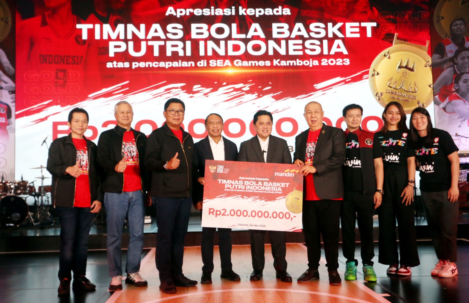 Jakarta, 24 Mei 2023 – Bank Mandiri menegaskan komitmen pembinaan kepada Atlet Bola Basket nasional. Kali ini, Bank Mandiri bersama anak perusahaan PT AXA Mandiri Financial Services (AXA Mandiri) memberikan apresiasi atas prestasi bersejarah medali emas ajang SEA GAMES 2023 yang direbut Timnas Basket Putri, beberapa waktu lalu di Kamboja.