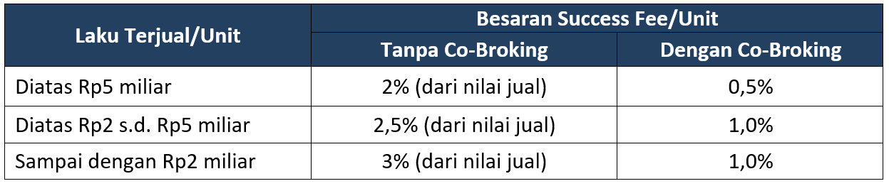 Kami menghargai setiap performa penjualan Anda dengan skema Success Fee yang kompetitif berdasarkan nilai transaksi per unit dengan dibagi menjadi 3 tiering berdasarkan nilai laku terjual sebagai berikut: