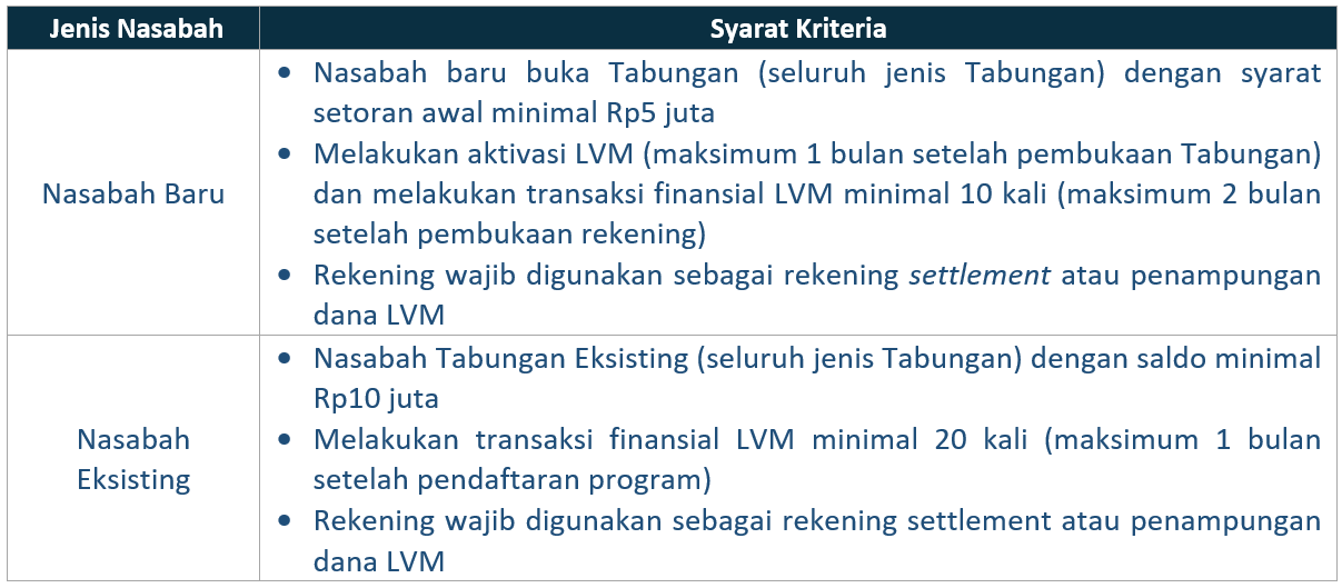 Seluruh Nasabah pebisnis terpilih pemilik Tabungan yang digunakan sebagai rekening settlement Livin’ Merchant (LVM) baik yang berstatus Nasabah Baru dan Nasabah Eksisting.