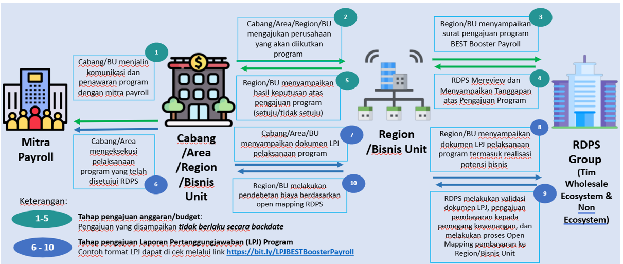 - Pelaksanaan program dapat dilakukan dalam bentuk program webinar dalam rangka akuisisi payroll baru, peningkatan balance/product holding/retensi/relationship management Nasabah payroll di Mitra Payroll B2B existing, dan pelaksanaan campaign/WhatsApp Blast/kegiatan aktivasi/peningkatan awareness produk dan program payroll secara general.