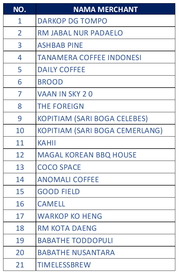 - Program berlaku untuk nasabah baru dan nasabah eksisting yang bertransaksi di merchant pilihan yang berada di Kota Makassar