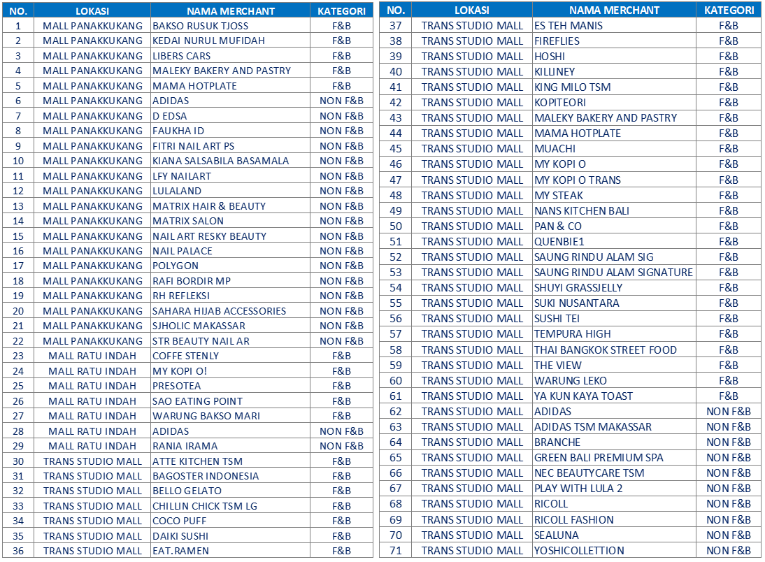 Merchant yang telah kerjasama dengan Bank Mandiri serta memiliki EDC/Livin’ Merchant Mandiri di: