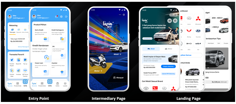 • Nasabah dapat akses Livin’ by Mandiri dan klik menu Auto kemudian akan intermediary page, selanjutnya Nasabah dapat memilih mobil, motor, atau pun riwayat.