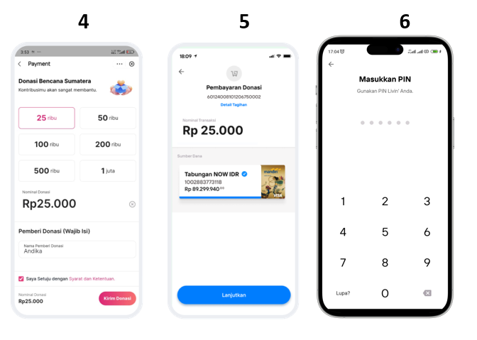 Pengguna Livin’ by Mandiri (icon kuning) dapat melakukan pembayaran Donasi. Pengguna dapat memilih mitra melalui kategori kemudian memilih campaign yang ingin didonasikan.