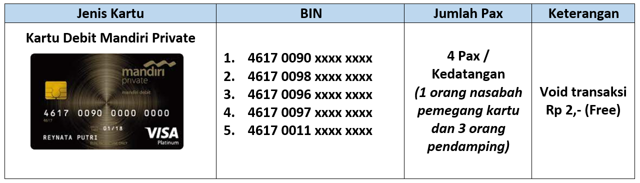 • Bebas biaya fasilitas airport executive lounge berlaku untuk nasabah dengan ketentuan sebagai berikut :