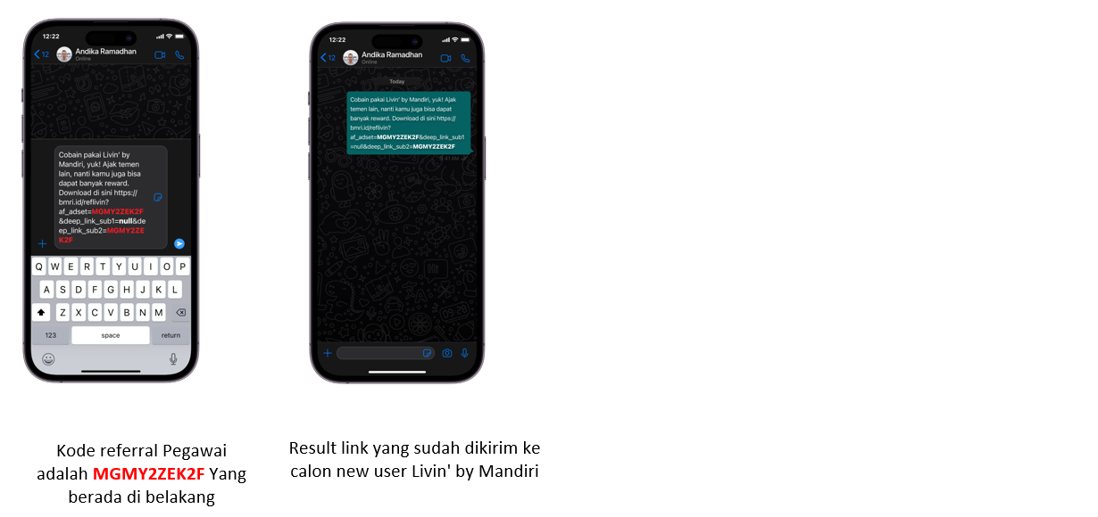 Kode referral akan ter-generate otomatis, tidak perlu diisi manual. Jika kode referral tidak muncul, maka bisa dilakukan input dengan kode referral berupa NIP. Impactnya jika memasukkan kode referral menggunakan NIP maka referral tetap masuk ke dashboard monitoring SSBI namun tidak muncul di monitoring melalui Inner Circle di Livin’ by Mandiri. Kode Cabang tidak otomatis terisi, perlu dilakukan pengisian oleh pegawai yang akan melakukan share link.