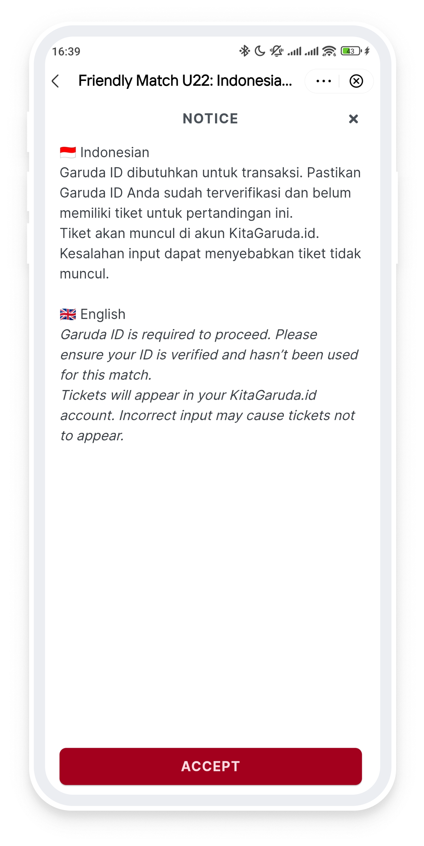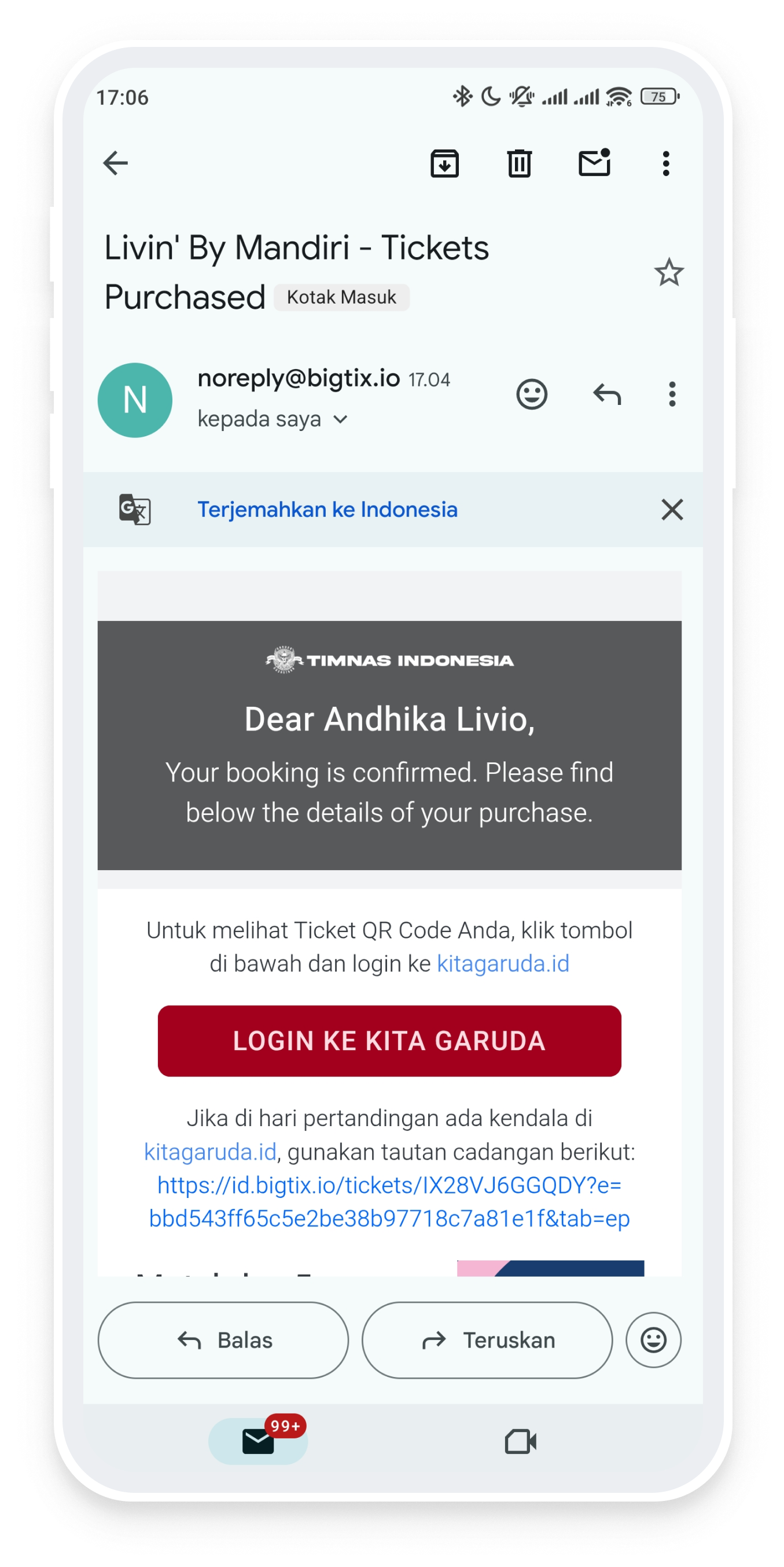 11. Setiap Pengguna akan menerima konfirmasi pemesanan tiket melalui e-mail. Barcode tiket akan tersedia di website kitagaruda.id dan dapat diakses H-1 sebelum pertandingan dimulai. Pengguna diminta untuk memastikan email user dan password untuk dapat Login ke website kitagaruda.id.