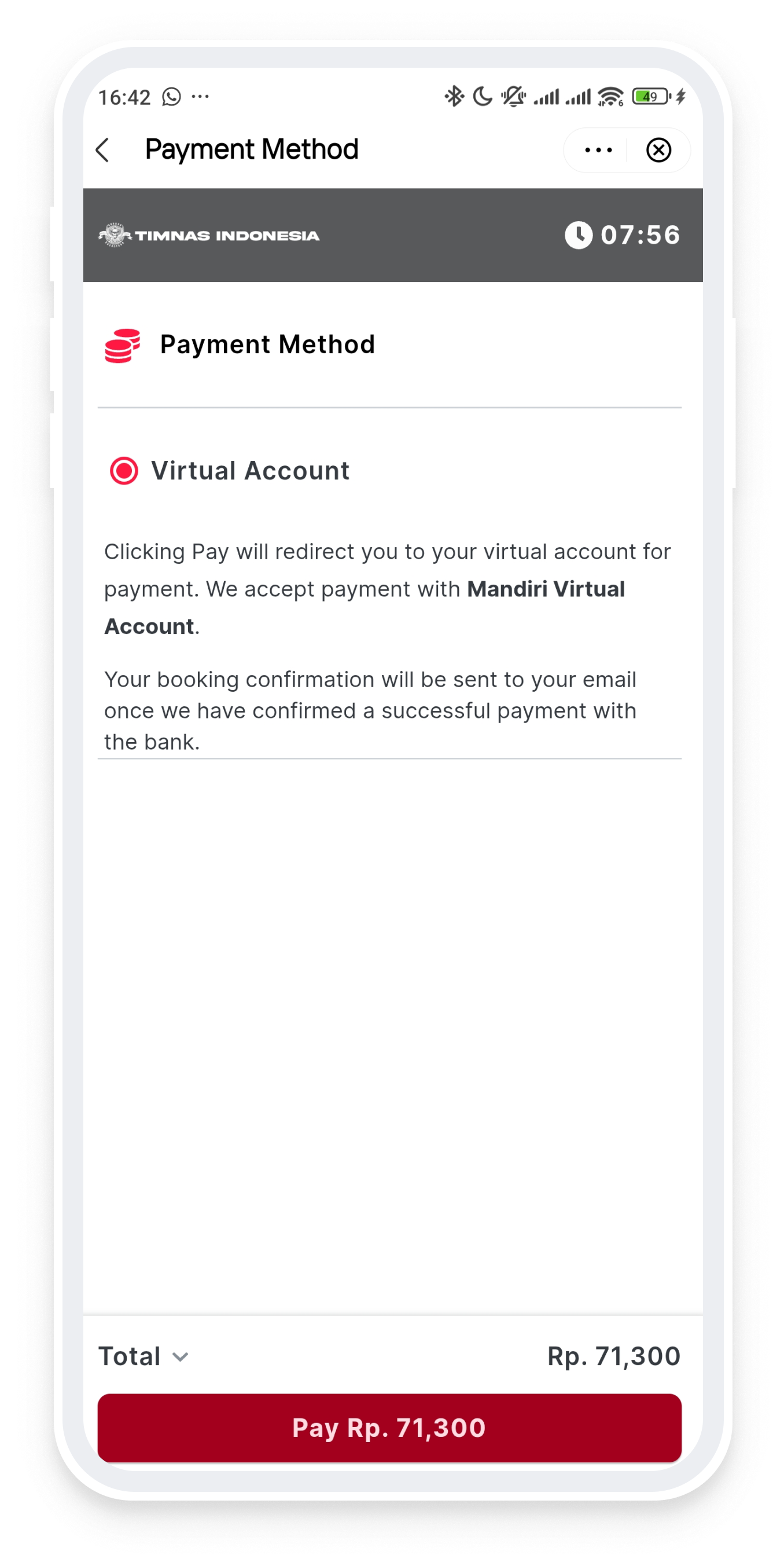 8. Untuk pelunasan pembayaran pembelian Tiket melalui mekanisme virtual account, maka Pengguna wajib melakukan pelunasan pembayaran paling lambat 10 (sepuluh) menit sejak waktu pembelian Tiket dilakukan. Mitra berhak untuk membatalkan pembelian Tiket yang dilakukan oleh Pengguna, jika Mitra belum menerima konfirmasi pelunasan pembayaran secara sukses di sistem Sukha pada waktu yang ditentukan.