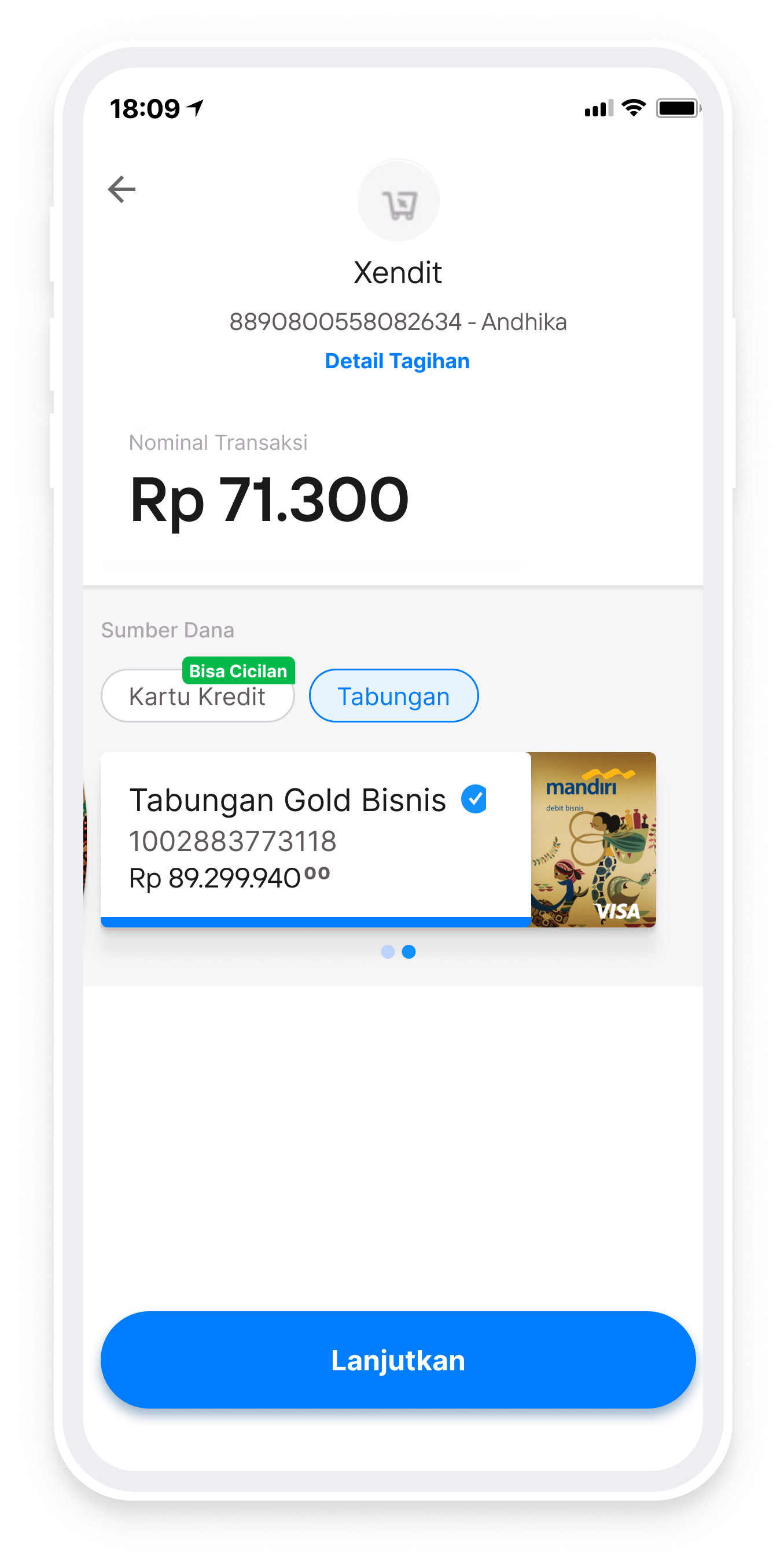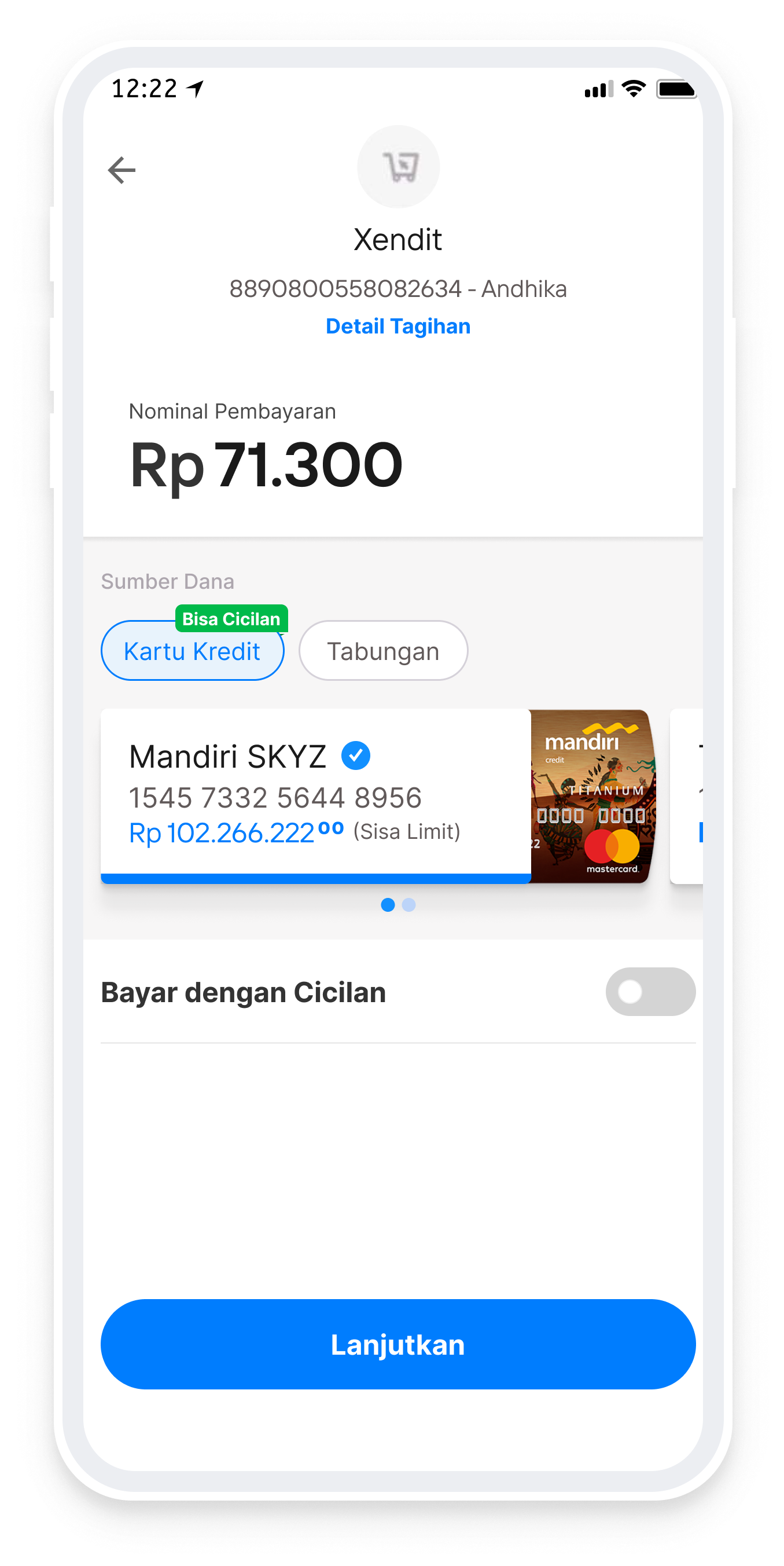 Pilih sumber dana Kartu Kredit, dan klik Lanjutkan |
