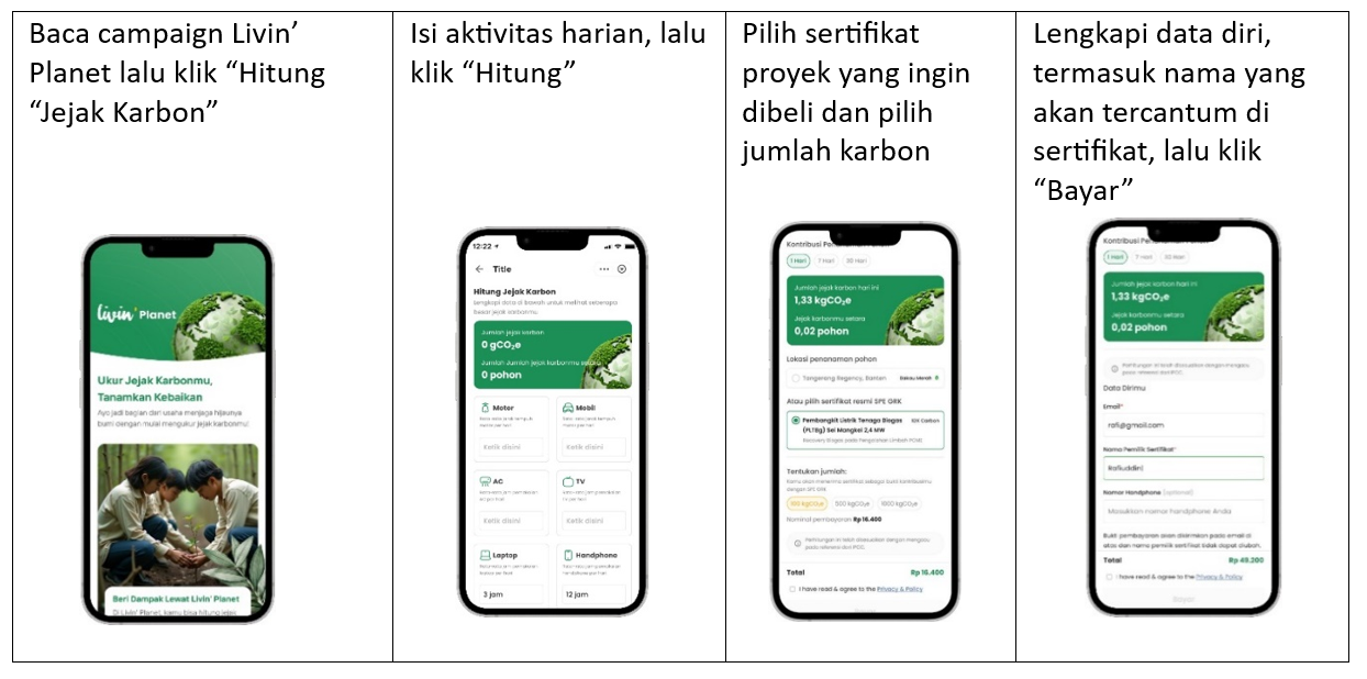 Saat ini sudah dapat dilakukan pembelian SPE GRK di Livin’ Planet melalui Livin’ Sukha. SPE GRK adalah unit karbon yang merepresentasikan sejumlah pengurangan emisi yang telah dihasilkan dari suatu proyek dan telah melalui proses pengukuran, pelaporan, serta verifikasi. Sertifikat ini menunjukkan bahwa emisi gas rumah kaca telah berhasil dikurangi atau dihindari, serta telah tercatat dalam Sistem Registri Nasional Pengendalian Perubahan Iklim (SRN PPI) dan dapat digunakan oleh individu maupun institusi untuk mengimbangi (offset) emisi dari aktivitas sehari-hari.