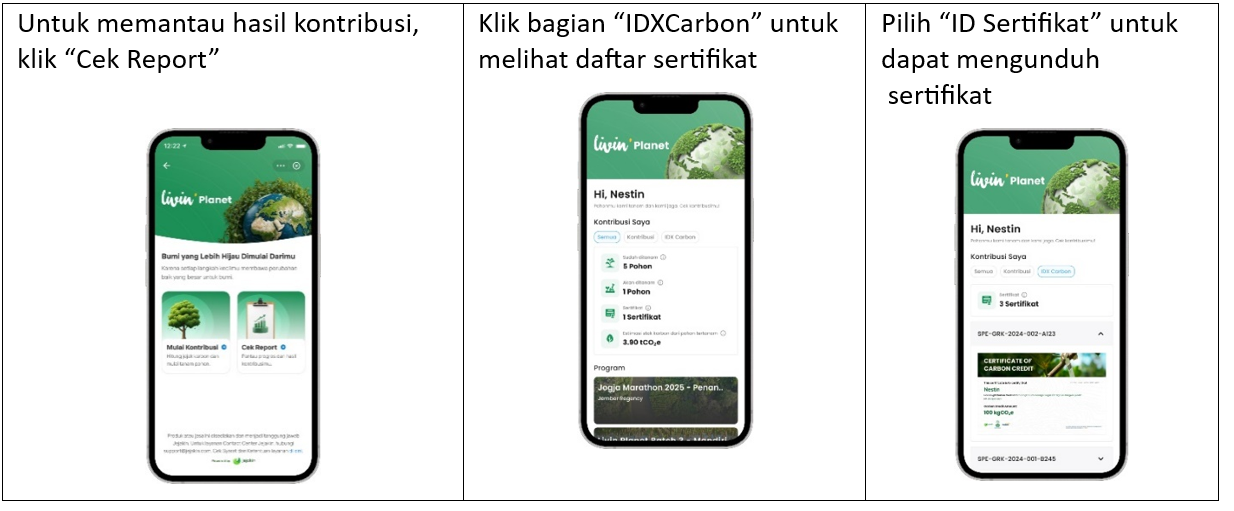 Bank Mandiri menyediakan Livin’ Planet sebagai platform pembelian SPE GRK. Jejakin berperan sebagai fasilitator yang menyediakan akses kepada pengguna untuk membeli SPE GRK, memproses transaksi, serta mengkoordinasikan proses penggunaan (retirement) sertifikat. Sementara itu, IDXCarbon berperan sebagai platform perdagangan karbon resmi di Indonesia. Validasi dan pengakuan atas penggunaan SPE GRK sepenuhnya mengacu pada sistem registri nasional dan otoritas terkait.