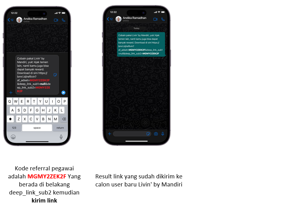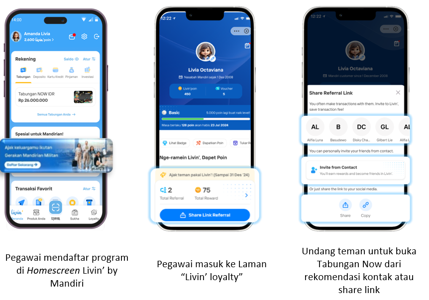 • Seluruh pegawai dapat mengikuti MGM dengan melakukan akuisisi Tabungan Nasabah Baru (New CIF) melalui fitur Livin’ Member Get Member di Livin' loyalty dengan "share referral link" atau share QR Personal, dan kirim ke kerabat/teman (rekomendasi, kontak telepon, atau share link). Pastikan kode referral sudah terisi dan input kode cabang agar dapat dilakukan tracking.