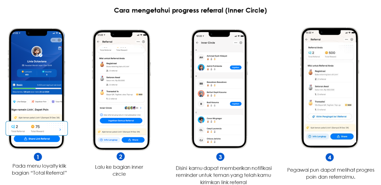 Pegawai dapat melakukan monitoring atas progress referral MGM di Livin’ by Mandiri melalui cara sebagai berikut: