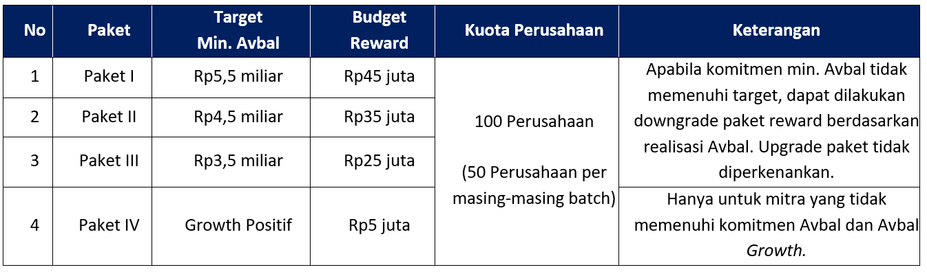 - Apabila total average balance pegawai Mitra/Perusahaan mengalami peningkatan, namun tidak memenuhi target komitmen paket manapun, maka akan mendapatkan reward paket 4 (empat). Namun apabila total average balance pegawai Mitra/Perusahaan mengalami peningkatan lebih dari paket yang dipilih pada komitmen awal, maka tetap akan mendapatkan reward sesuai paket komitmen yang ditentukan di awal.