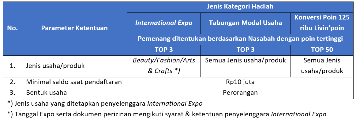 - International Expo: ditentukan berdasarkan nasabah dengan jumlah poin tertinggi (3 nasabah) pada kategori jenis usaha: produk FnB/Beauty/Fashion/Arts & Crafts.
