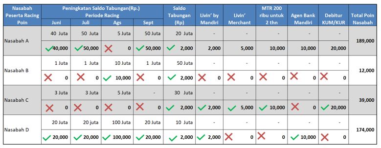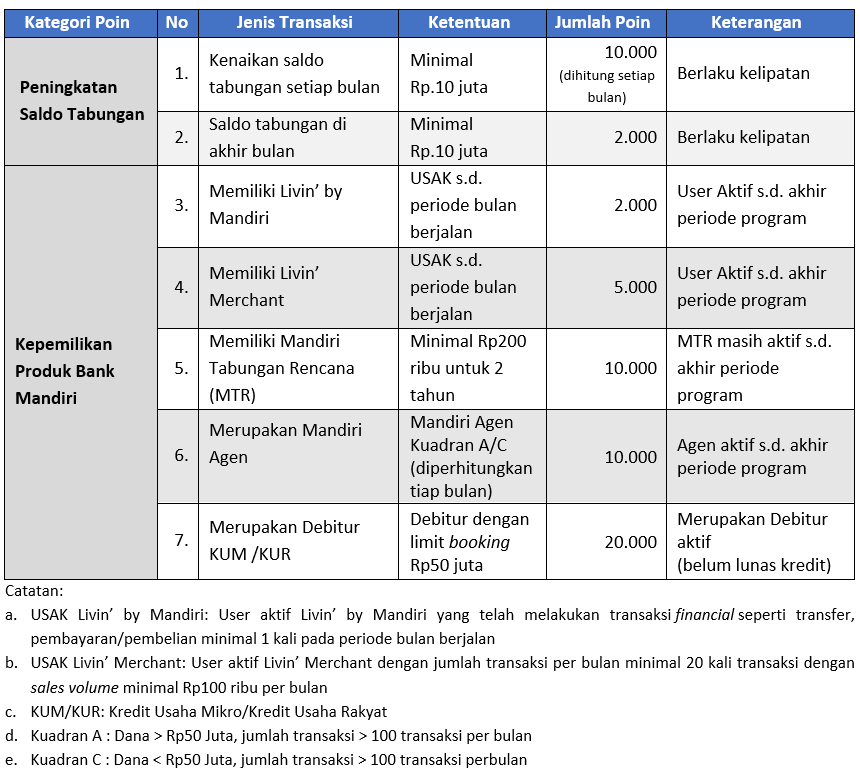 - Poin harus didapatkan dari aktivitas transaksi, kepemilikan produk Bank Mandiri dan penambahan dana tabungan nasabah yang benar dan wajar.