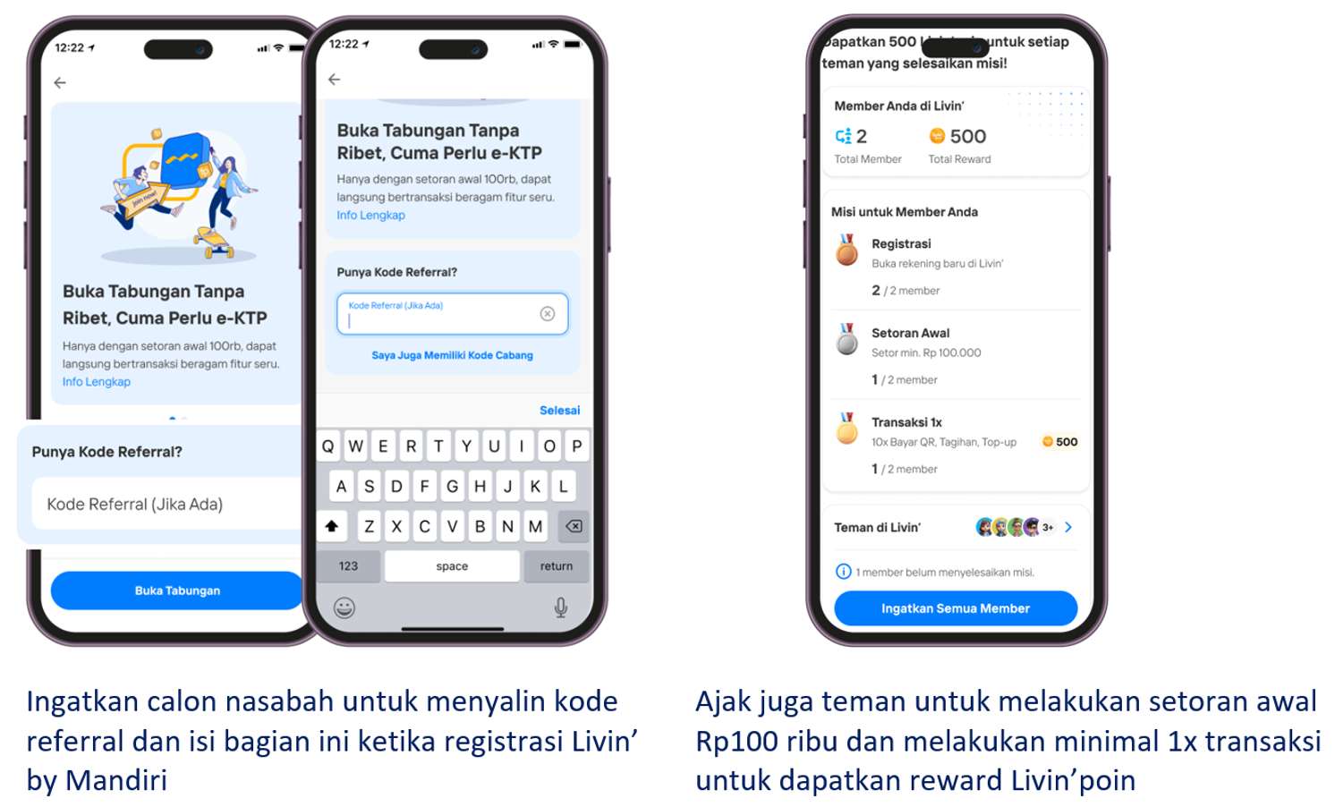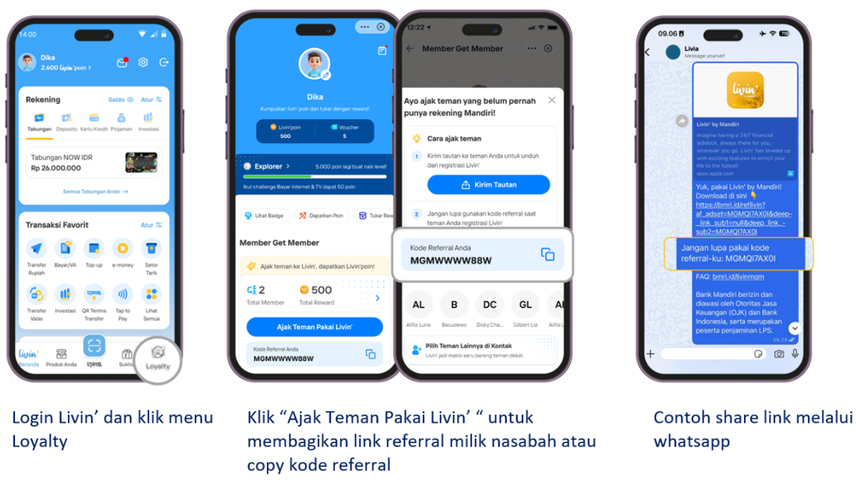 *) Rewards referral 500 Livin’poin untuk journey buka rekening, setoran awal dan transaksi finansial Livin’ mengikuti mekanisme Program Member Get Member (MGM)