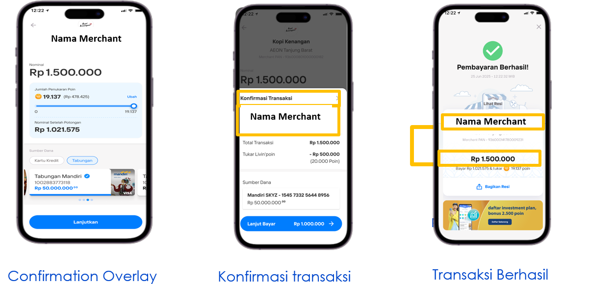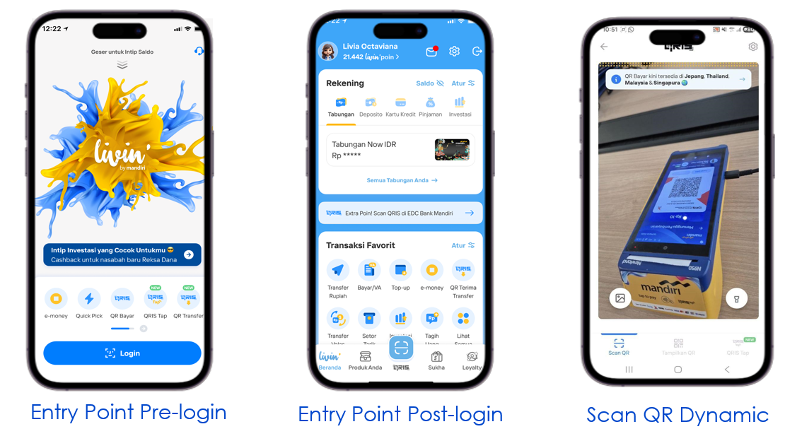 - Transaksi QR Bayar Livin’ by Mandiri melalui Sumber Dana Tabungan dan/atau Kartu Kredit di QRIS Dinamis EDC Bank Mandiri.
