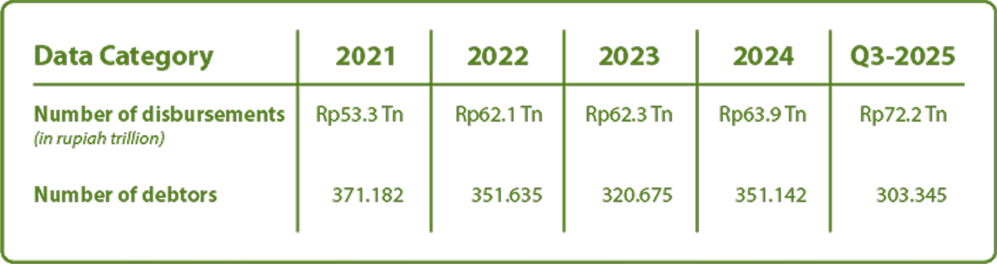 Kredit Usaha Mikro diberikan kepada usaha yang produktif secara finansial seperti kebutuhan investasi atau modal kerja, dengan batasan Rp 10 juta hingga Rp 500 juta bagi pengusaha mikro yang layak namun belum terjangkau oleh bank. Total penyaluran Kredit Usaha Mikro sampai dengan Kuartal II tahun 2023 mencapai 28.135.636 dengan jumlah debitur sebanyak 423.477. Penyaluran Kredit Usaha Mikro (KUM) memiliki rasio debitur perempuan yang cukup besar yaitu sebesar 67,7%.