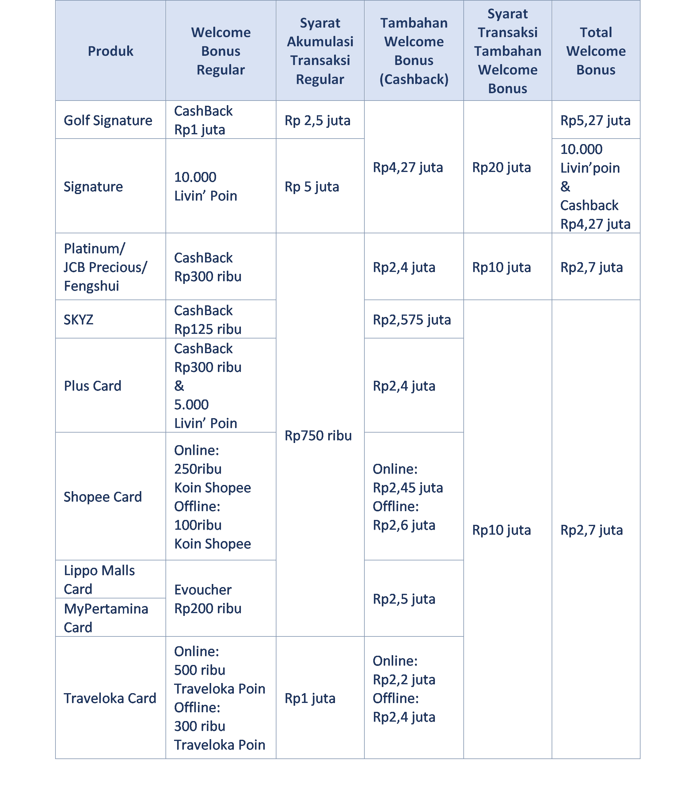 - Welcome Bonus Reguler & tambahan berupa Cashback dapat diberikan apabila memenuhi kriteria transaksi selama 3 bulan sejak kartu disetujui dengan detail sebagai berikut: