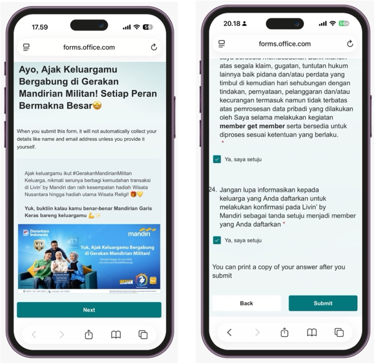 - Pegawai mengisi data sesuai field yang terdapat pada link pendaftaran (pastikan pegawai mengetahui kode referral milik keluarga yang akan didaftarkan pada halaman Livin' Loyalty di Livin' by Mandiri).