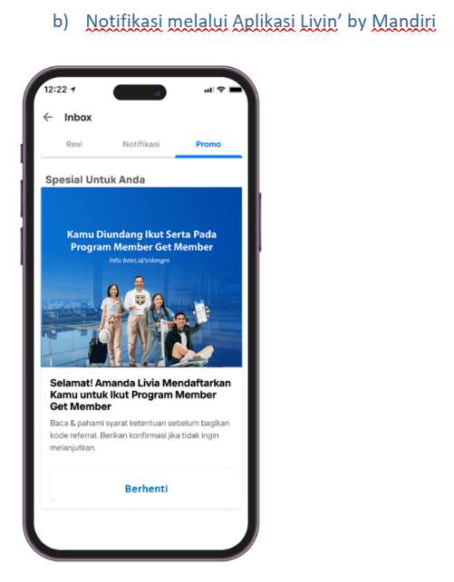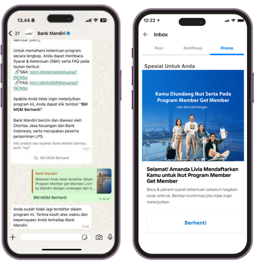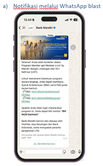 Jika nasabah ingin berhenti dari program member get member dapat Klik ‘BM MGM Berhenti’ di tombol WA blast, atau klik tombol berhenti di InApp Livin’ by Mandiri
