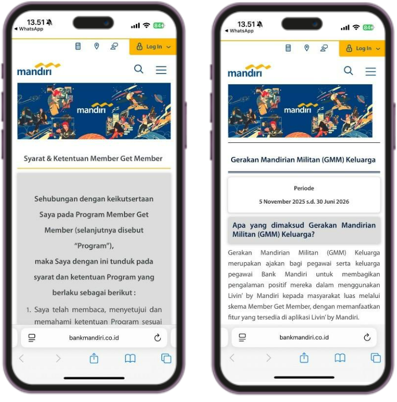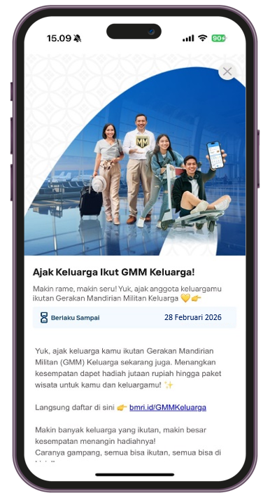 - Keluarga Pegawai yang ingin berkontribusi dan bergabung dalam GMM Keluarga perlu melakukan konfirmasi kesediaan keikutsertaan pada halaman persetujuan kesediaan “Syarat & Ketentuan” melalui Livin’ by Mandiri. Konfirmasi persetujuan paling lambat dilakukan 2x24 jam setelah menerima push notification konfirmasi keikutsertaan.