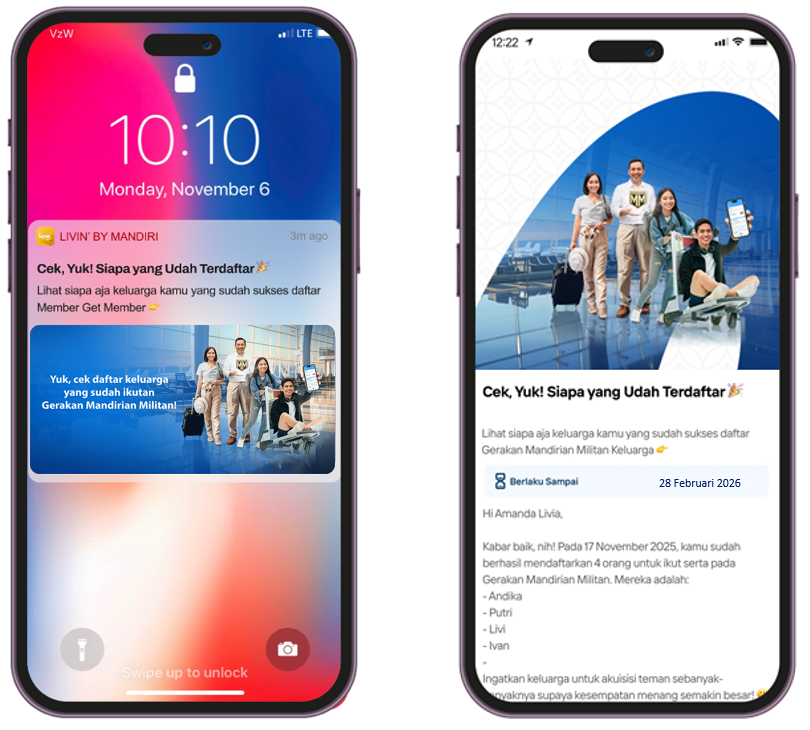 Notifikasi akan dikirimkan oleh Bank Mandiri melalui WhatsApp blast dari Bank Mandiri atau notifikasi di aplikasi Livin’ by Mandiri yang menginformasikan bahwa keluarga telah terdaftar dalam Program Member get Member Livin’ by Mandiri, beserta link informasi syarat dan ketentuan program. Keluarga sudah dapat melakukan akuisisi setelah terdaftar program.