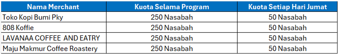 - Setiap merchant mendapatkan kuota cashback sebanyak 250 nasabah selama periode program dengan pembatasan kuota sebesar 50 nasabah setiap hari Jumat (terdapat 5 kali hari Jumat pada bulan Oktober 2025), dengan detail sebagai berikut :