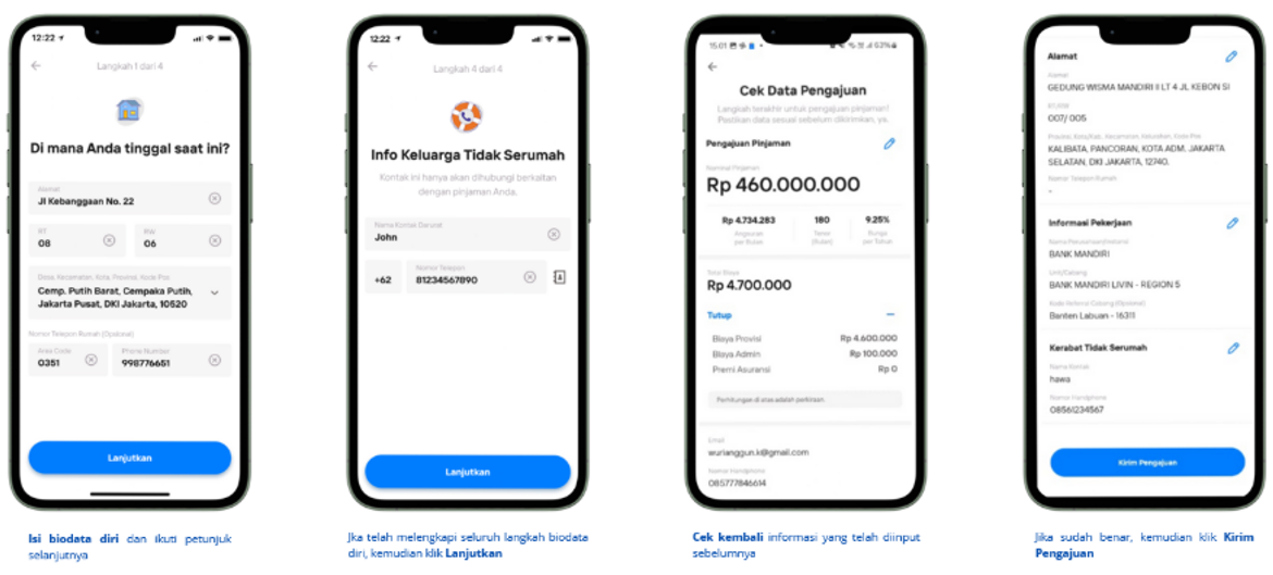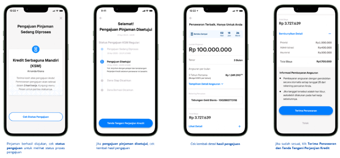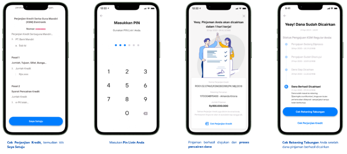 • Pengajuan aplikasi dapat dilakukan baik melalui Unit dan Cabang terdekat dan maupun melalui aplikasi Livin’ by Mandiri dan channel Telesales.