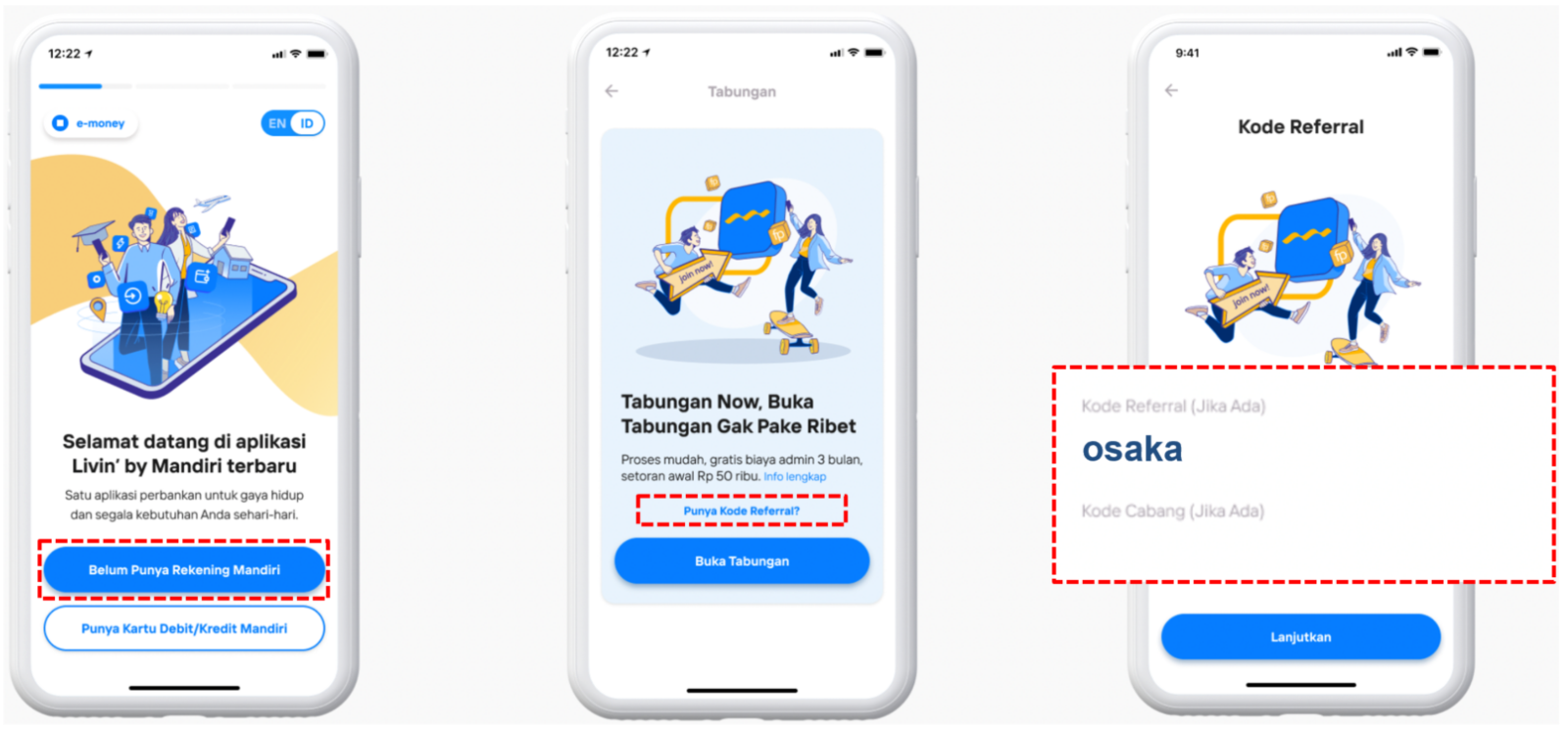 - Pembukaan rekening online melalui Livin’ by Mandiri menggunakan QR/Link Referral/memasukkan kode referral