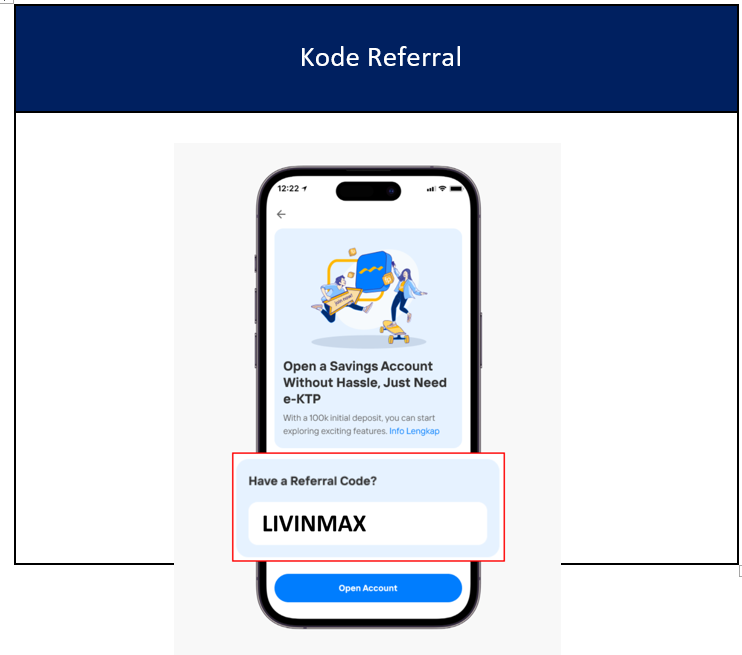 - Nasabah melakukan pembukaan rekening Tabungan NOW dan wajib memasukkan kode referral “LIVINMAX” pada laman aplikasi Livin’ by Mandiri sebagai berikut: