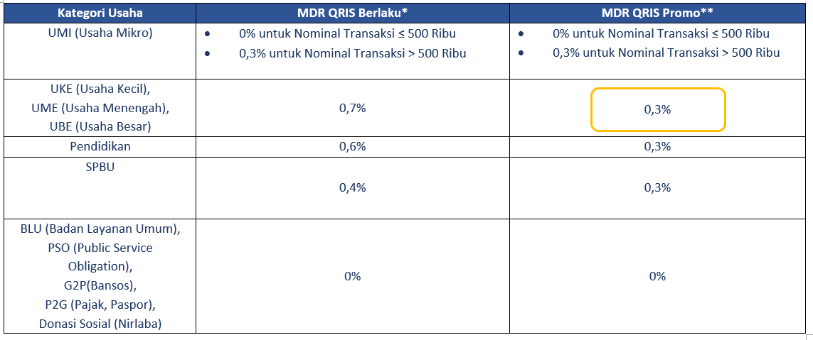 - Biaya MDR QRIS 0% untuk Merchant Usaha Mikro (jika nominal transaksi kurang dari Rp500 ribu), serta Biaya MDR special untuk merchant Usaha non Mikro hanya dengan biaya MDR special rate 0,3% (dari MDR regular 0,7%) hingga 31 Desember 2026.