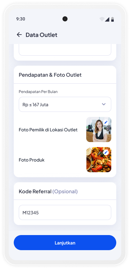 Lengkapi data Pendapatan, Foto usaha Anda dan Kode Referral (opsional) lalu Tap Lanjutkan untuk melanjutkan pendaftaran.