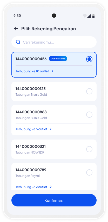 Anda dapat melihat daftar rekening yang anda miliki, tap pada rekening yang ingin anda gunakan sebagai rekening pencairan pada outlet.