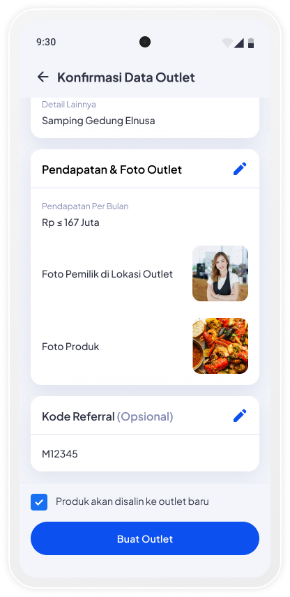 Anda dapat melakukan salin produk dari Outlet Utama. Tap Buat Outlet untuk melanjutkan Tambah Outlet
