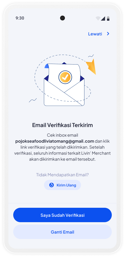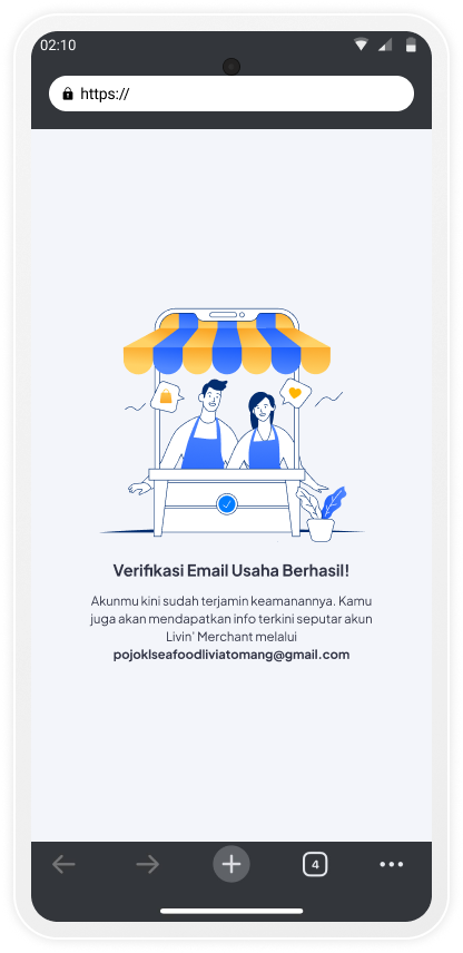 Anda akan diarahkan ke screen Verifikasi Email Usaha Berhasil. Selanjutnya anda dapat kembali ke aplikasi Livin’ Merchant.