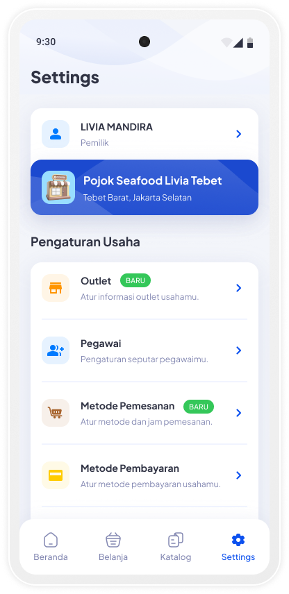Untuk melakukan pengaturan outlet, tap menu Settings pada Navigation Bar atau klik pada profile outlet di homescreen