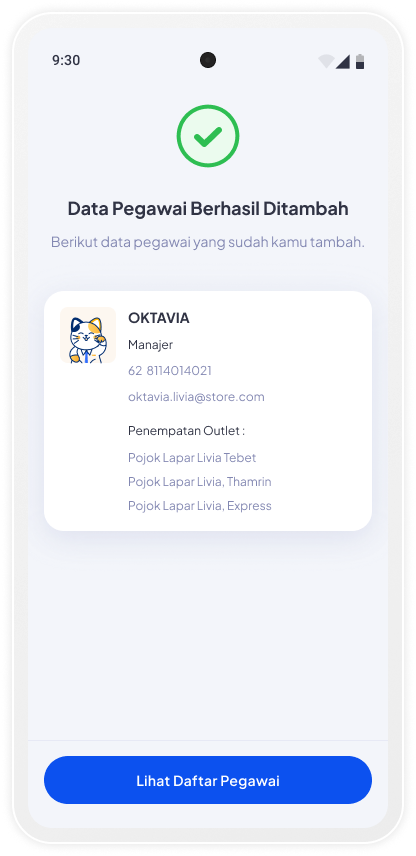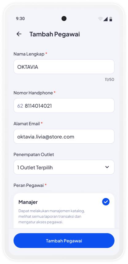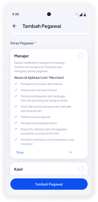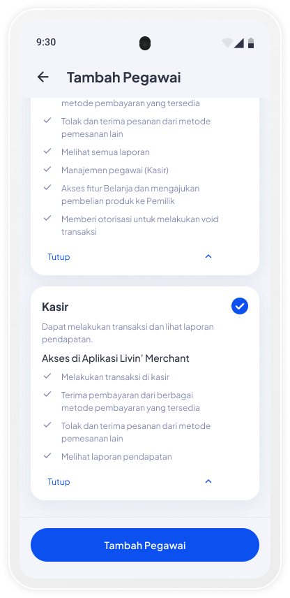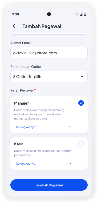 Tambah pegawai baru dan atur fitur yang bisa diakses sesuai peran masing-masing. Cek langkahnya di sini